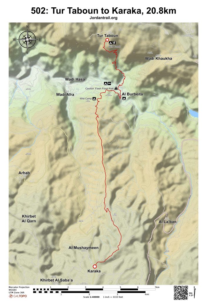 - For camping, better to camp either near Wadi Hasa / Burbeita, near the Qasrein spring, or perhaps near the first farm before the stage ends in more built up areas.