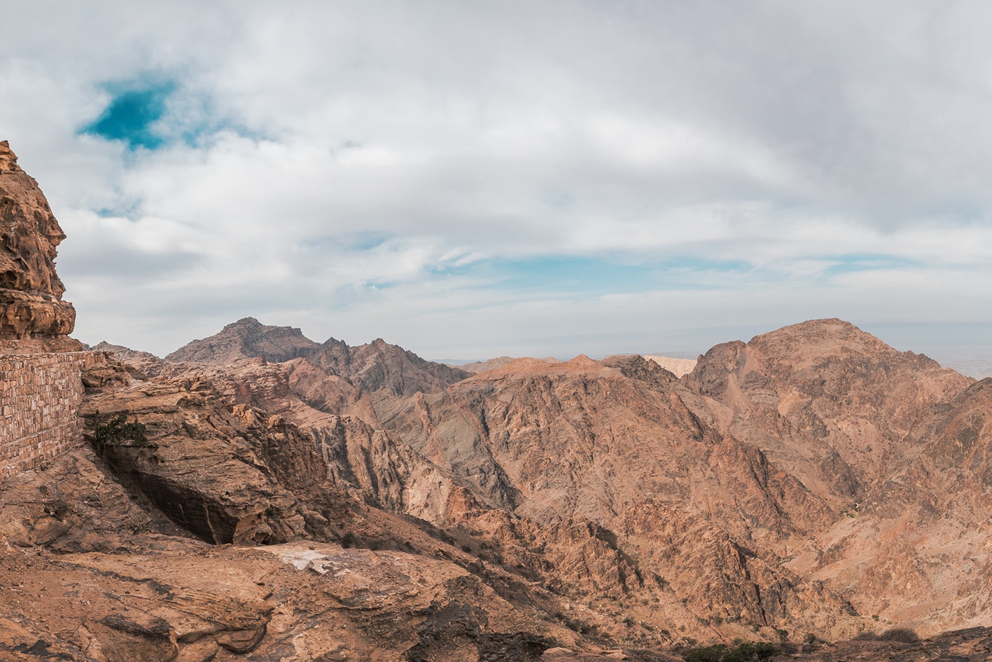 Petra via ‘The Back Door’! Good tracks go pleasantly down Wadi Ghurab amidst sandstone mountains guarding the approaches to Petra. This way follows a Nabataean route out of the valley and skirting round the final mountain on a natural rock terrace which has been ‘improved’ by the PAP for the safety of walkers. Even so, it still narrows slightly before reaching a hidden plateau high above the impressive chasm of Wadi Siyyagh. Just beyond, carved into the cliff face, ‘The Monastery’ suddenly comes into view. (Bedouin café). Nabataean steps then lead down into ancient Petra, through which the route goes before exiting past ‘The Treasury’ and though the famous ‘Petra Siq’ to the shops, cafés and hotels of Wadi Musa.
